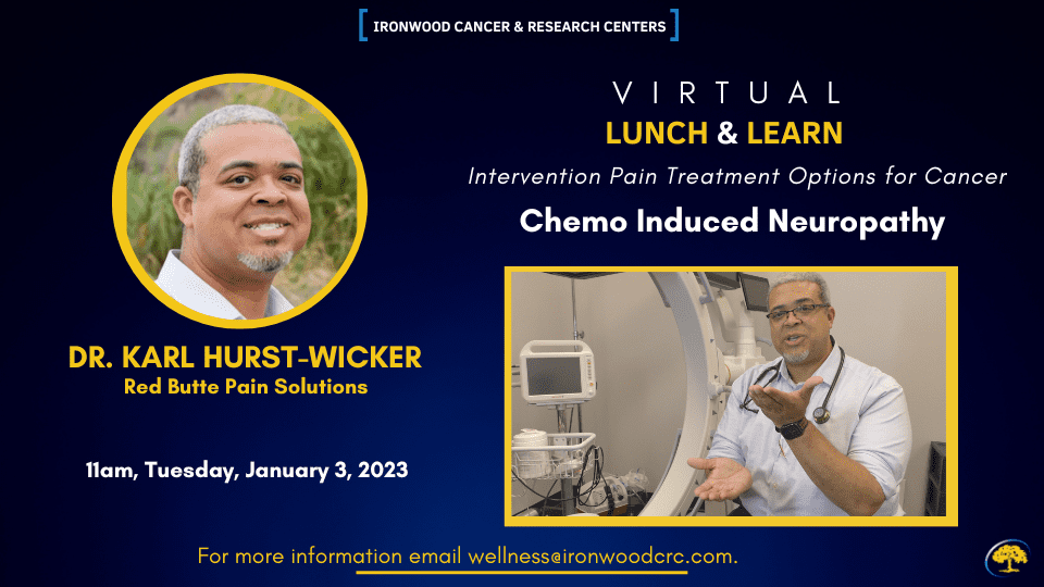 The Virtual Lunch & Learn “Integrative Pain Treatment Options for Cancer: Chemo Induced Neuropathy” was recorded for release on Tuesday, January 3, 2023. We would like to thank the Ironwood Supportive Care Services Department and Karl Hurst-Wicker, MD for this video.