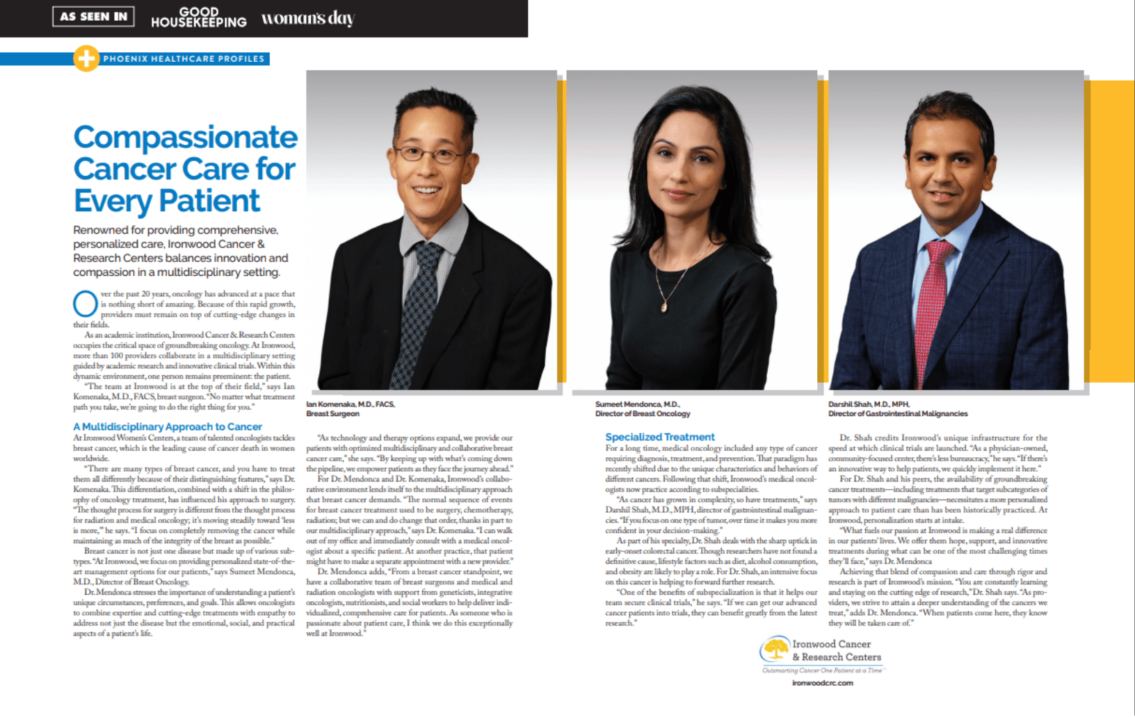 We’re excited to share that Ironwood Cancer & Research Centers have been featured in an article highlighting our innovative, multidisciplinary approach to cancer treatment. Discover how our dedicated team, including Dr. Darshil Shah, Dr. Ian Komenaka, and Dr. Sumeet Mendonca, is pioneering personalized care and advancing research to provide the best outcomes for our patients. Read the full article to learn more about our commitment to compassionate, cutting-edge oncology care.