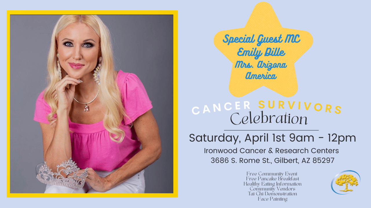 At the Ironwood Cancer & Research Centers Survivors Day Celebration Breakfast, Emily Dille (Mrs. Arizona & former Ironwood Patient) will be our guest MC! Join us from 9am-12pm, Saturday, April 1st at our Gilbert office for this free event.