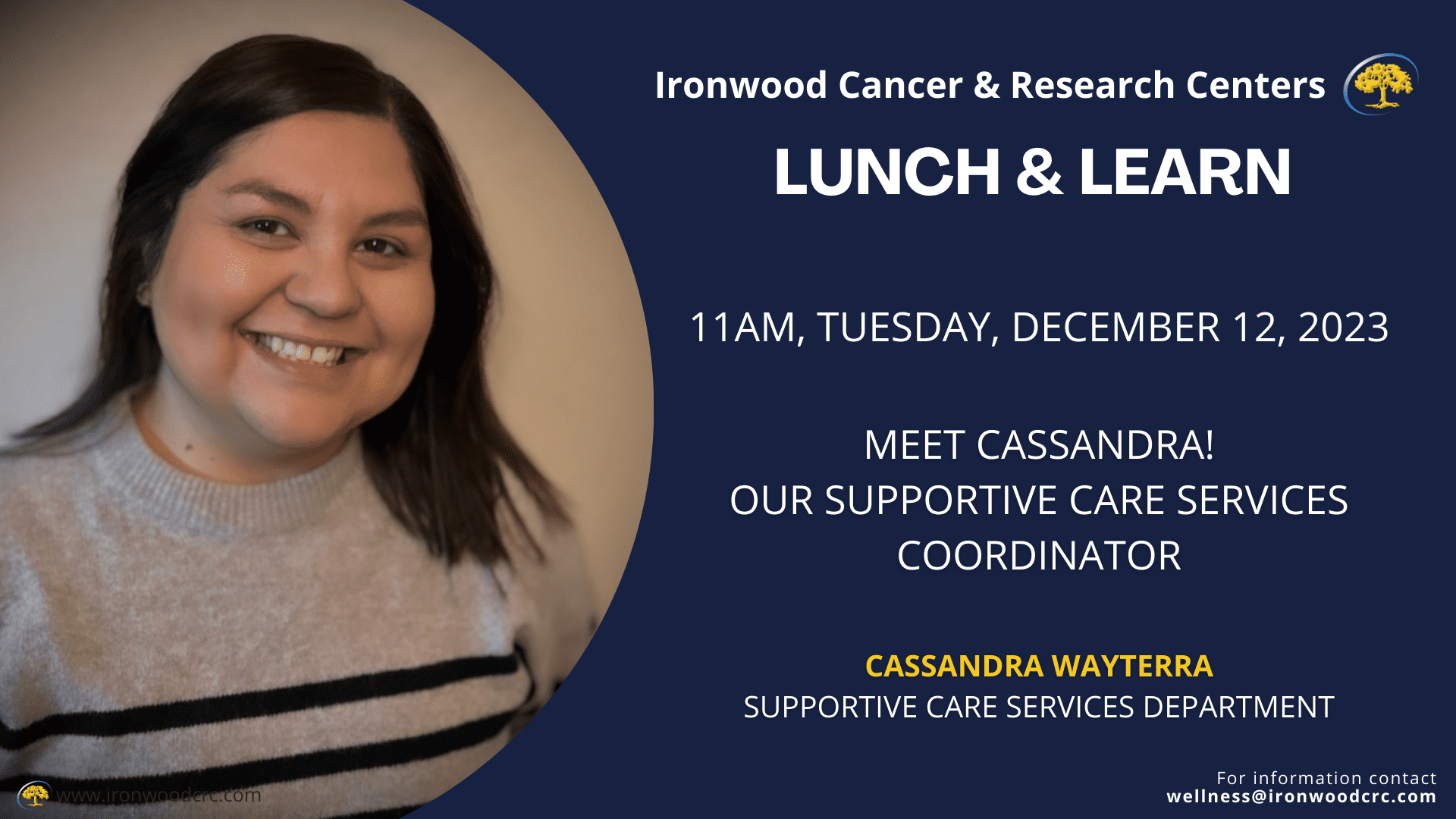 The Virtual Lunch & Learn “Meet Our Supportive Care Services Coordinator Cassandra” was recorded for release on Tuesday, December 12, 2023. We would like to thank the Ironwood Supportive Care Services Department, Cassandra and Nicole McCallister for this video.