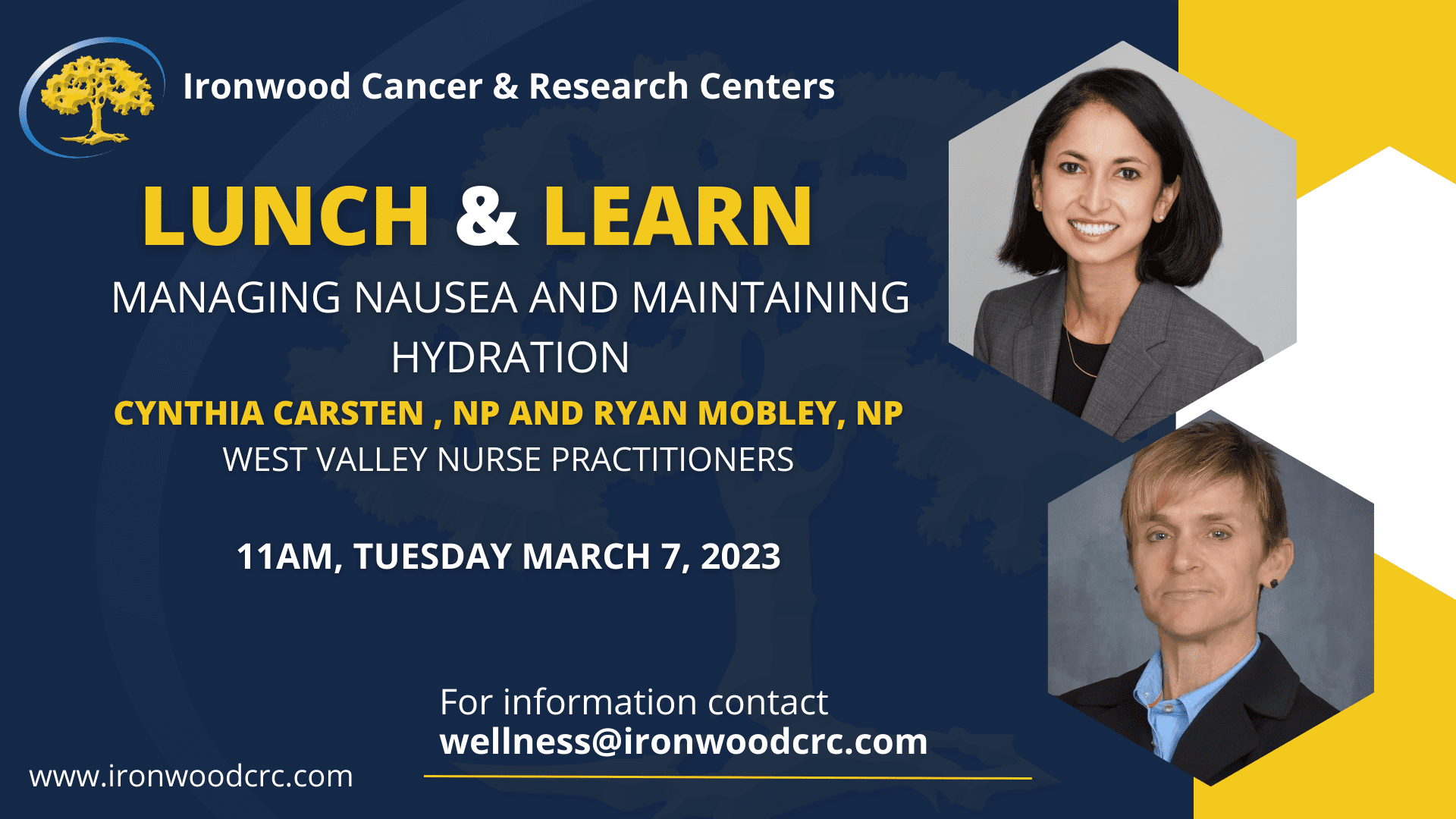 The Virtual Lunch & Learn “Managing Nausea and Maintaining Hydration” was recorded for Tuesday, March 7, 2023. We would like to thank the Ironwood Supportive Care Services Department, west valley nurse practitioners Cynthia Carsten, NP and Ryan Mobley, NP for this video.