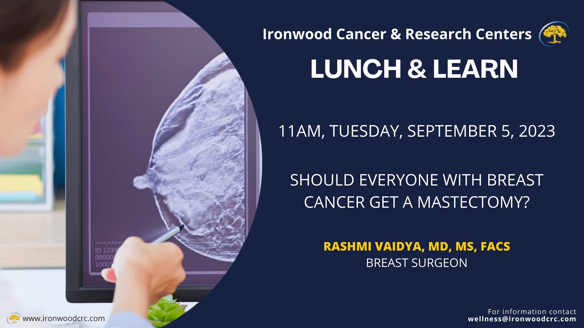 Today’s featured speaker is Dr. Rashmi Vaidya. She is a Breast Surgeon at Ironwood Women’s Center at our Phoenix and Glendale offices. She will be discussing mastectomies and breast cancer.